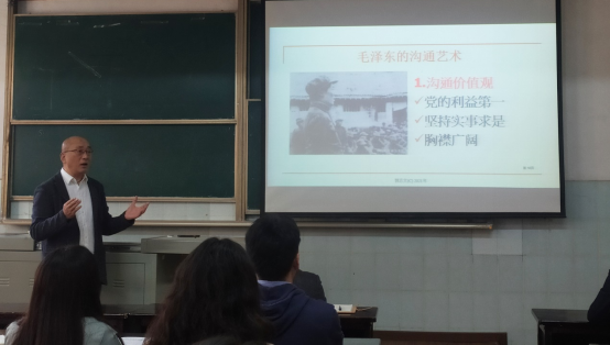 培训会上,郭志文教授从“高等教育是培养社会精英?还是培养国家栋梁?”这一根本问题发问,围绕课程思政的缘起、课程思政的内容、课程思政的挖掘和课程思政的实施四个方面展开。郭教授从新时代党和国家对高等教育人才培养的新要求出发,对课程思政的缘起、内涵、维度、影响及与思政课程的区别等进行分析。并以其此次立项的示范课程《管理沟通》为例,提出要构建包括培养言行一致、积极向上的“三立”习惯;具备诚实敬业、改革创新的“四有”素养;坚守政治认同、家国情怀的“五爱”思想;践行自强不息、克难奋进的“习坎”精神在内的课程思政内容体系。在课程思政的素材挖掘和实施上,郭教授以《管理沟通》课程中的“那盏照亮中国的马灯:第4讲 沟通并非易事”为例,以毛泽东同志在苟坝会议中的沟通艺术作为典型案例,进行了一场生动而深刻的现场教学示范。最后,郭教授总结提出要充分认识课程思政的价值、保持对课程思政的敏锐性、认真挖掘课程思政的素材、以润物细无声来开展教学。