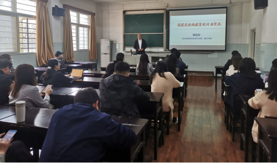 为深入贯彻落实全国高校思想政治工作会议、全国教育大会等会议精神,深入实施《高等学校课程思政建设指导纲要》,进一步落实立德树人的根本任务、提升学院教师教研能力,按照学校统一部署,10月27日下午,tyc122cc太阳成集团邀请教育部课程思政教学名师、湖北名师、教育部课程思政示范课程负责人郭志文教授作了题为《课程思政的教学设计与实施》的专题报告。本次课程思政建设专题培训由张小进副院长主持,学院党委书记唐良敬、学院副院长李荣娟和学院各系专职教师参加会议。