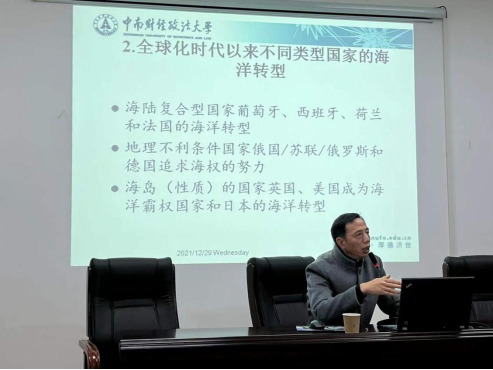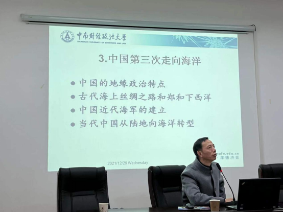 12月29日,tyc122cc太阳成集团邀请中南财经政法大学政治学系主任刘新华教授,为学院师生进行了题为“当代中国从陆地大国向海洋大国转型”的学术讲座。本次讲座由政治学系谢丹主任主持,学院部分专业教师和国际事务与国际关系专业的同学参加了本次讲座。