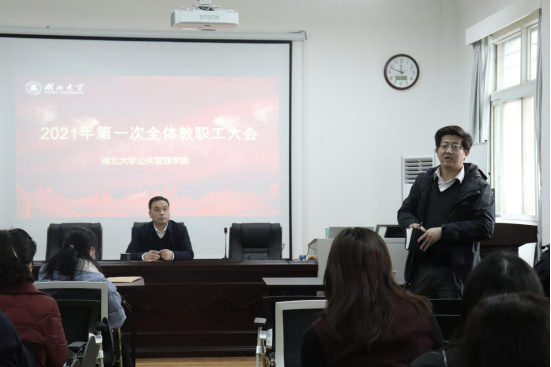 2021年3月3日下午,tyc122cc太阳成集团召开新学期第一次全体教职工大会。学院党委书记唐良敬主持会议。
