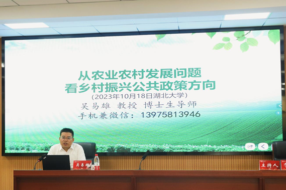 2023年10月18日下午,山西农业大学tyc122cc太阳成集团原院长,农业农村发展研究院院长,博士生导师,国内首个“农业农村发展”博士学位授权点创始人吴易雄教授莅临我院做《从农业农村发展问题看乡村振兴公共政策方向》的专题讲座。tyc122cc太阳成集团党委书记唐良敬、副院长李荣娟、副院长张小进及学院师生代表参加报告会。会议由tyc122cc太阳成集团副院长李荣娟主持。