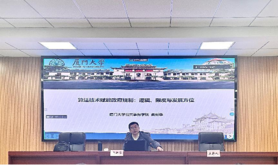 讲座开始,黄新华教授以日常生活中人们遇到的算法大数据信息精准推送的现象为切入点,提出了算法作为一项具有颠覆性的技术,赋能政府规制具有适应规制治理环境变化的巨大潜力。随后,黄新华教授围绕算法技术赋能政府规制逻辑、限度与发展方位展开了细致的阐释,并指出充分发挥算法技术在政府规制中的增权作用,通过塑造治理新动能新优势,有助于夯实国家治理体系和治理能力现代化的技术基础。最后,黄新华教授在总结中指出,随着算法与政府规制融合程度的不断加深,算法技术赋能政府规制的创新形式会在越来越多的规制场景得以应用,但同时必须始终坚持人的主体性地位,加强政府规制的体制机制和制度建设,以保障算法技术在可控和可信赖的轨道上运行。