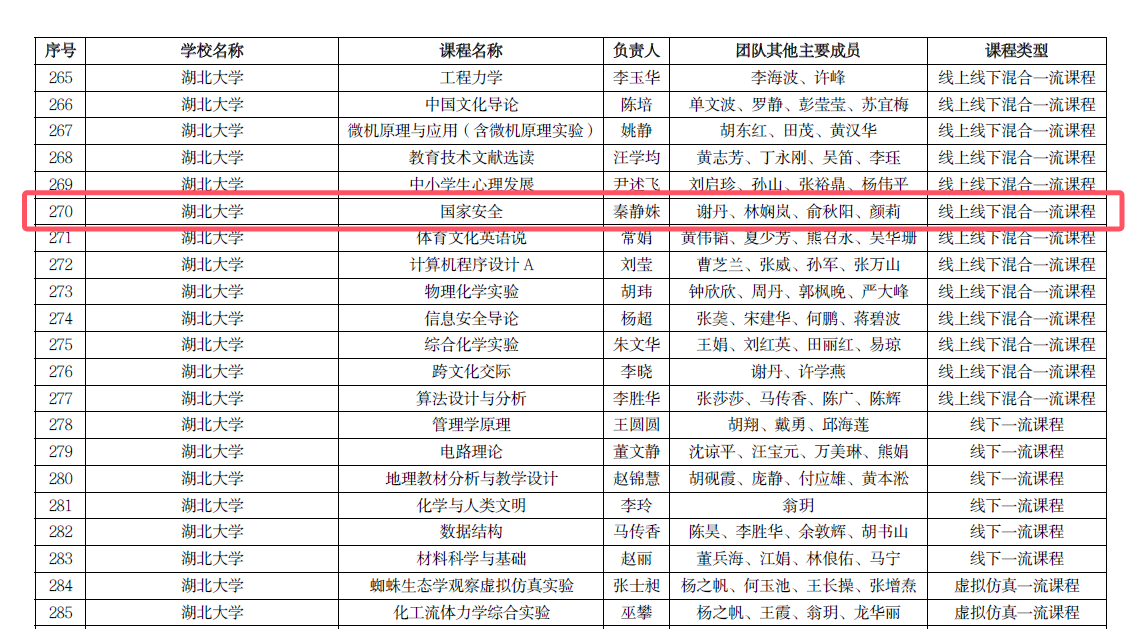 近日,根据《省教育厅关于公布2024年度省级一流本科课程认定结果的通知》(鄂教高办函〔2024〕9号),太阳成集团tyc122ccvip26门课程获批2024年度省级一流课程,我院秦静姝老师负责的《国家安全》课程获批2024年度省级线上线下混合一流课程。