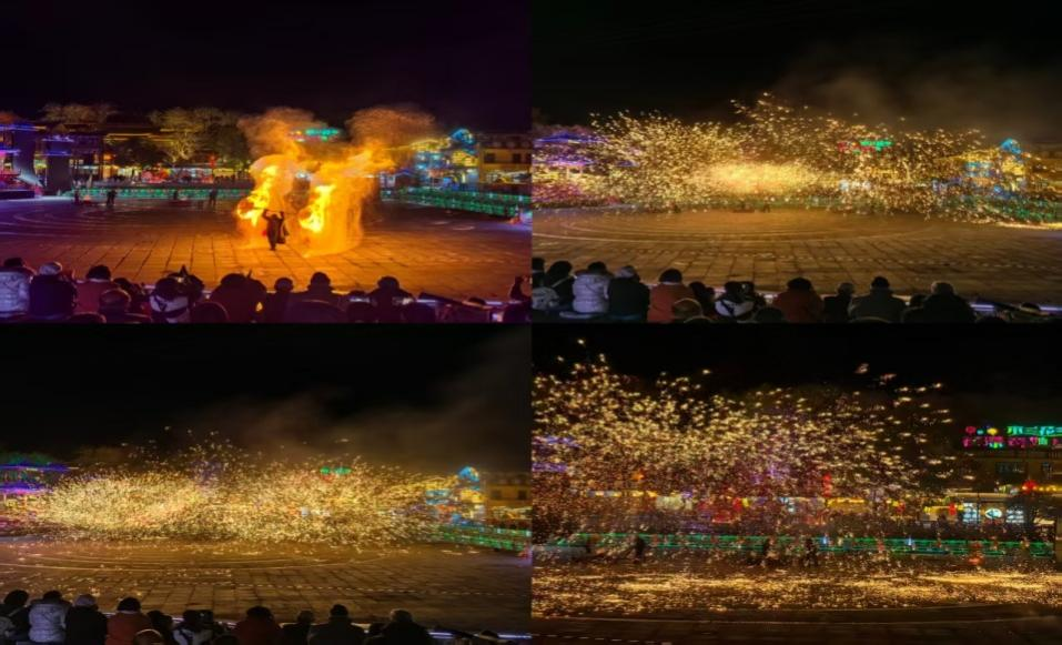 活动高潮当属国家级非遗“打铁花”表演。夜幕初降,匠人手持木勺,舀起一瓢1600℃的铁水奋力抛向高空,另一人挥动木板迎击,刹那间铁水如金蛇狂舞,迸裂成万千璀璨星火。漫天铁花裹挟着呼啸的风声倾泻而下,似银河倒悬、流星坠地,又似泼墨挥洒出一幅流动的“火树金花图”。这一传统技艺的震撼演绎,引得全场惊叹连连,不仅展现了工匠精神,更让老师们感受到中华文化的深厚底蕴。