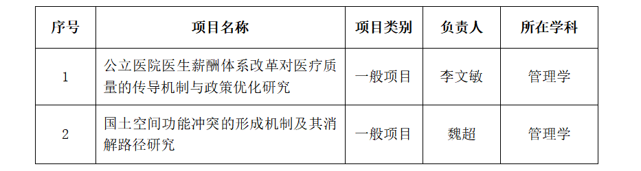 近日,全国哲学社会科学工作办公室公布2025年国家社会科学基金年度项目立项名单,我院获批2项国家社会科学基金年度项目,分别为李文敏教授申报的《公立医院医生薪酬体系改革对医疗质量的传导机制与政策优化研究》和魏超老师申报的《国土空间功能冲突的形成机制及其消解路径研究》。