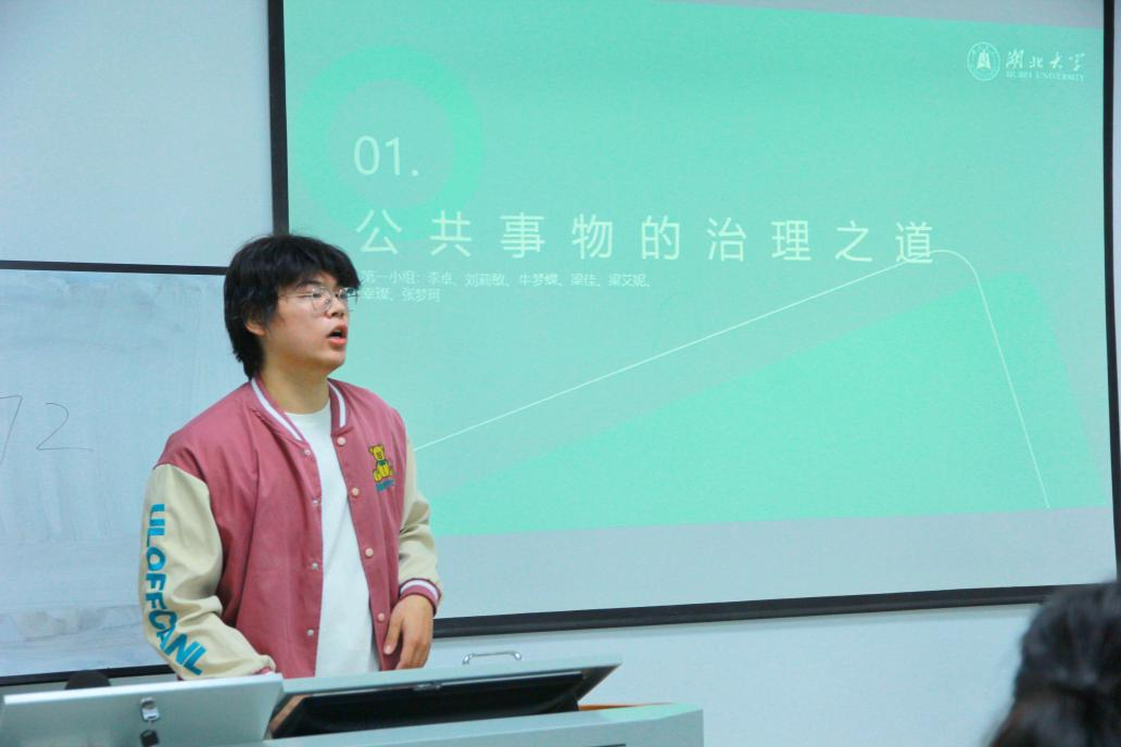 李卓、张孟珂同学代表第一组率先分享埃莉诺·奥斯特罗姆《公共事务的治理之道》的核心观点,以瑞士高山草场的经典案例为切入点,剖析“公地悲剧”的核心矛盾,展现奥斯特罗姆公共事务治理智慧的现实映照。总结环节,张孟珂强调理论突破价值:打破“政府-市场”二元思维,提供互联网时代共享资源管理新路径—通过使用者共参规则制定与监督,实现多元共治。
