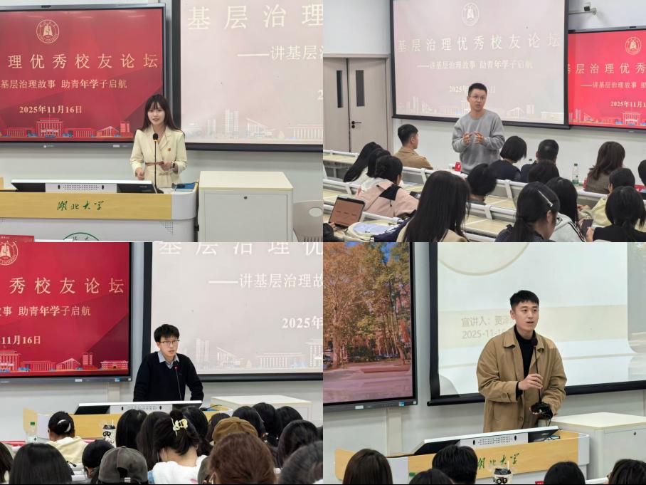 2025年11月16日,tyc122cc太阳成集团基层治理优秀校友论坛在长江新区校区举办。2008级校友蔡昌利、2018级校友陈军武、2020级校友贾泽阳等优秀校友重返母校,与2025级行政管理、国际事务与国际关系专业146名学生相聚鄢家湖畔,面对面分享在校记忆与基层工作感悟。学院党委书记唐良敬、党委副书记余欢、行政管理系副主任陈娟、辅导员李鑫泽、陈欣艺参与本次活动。