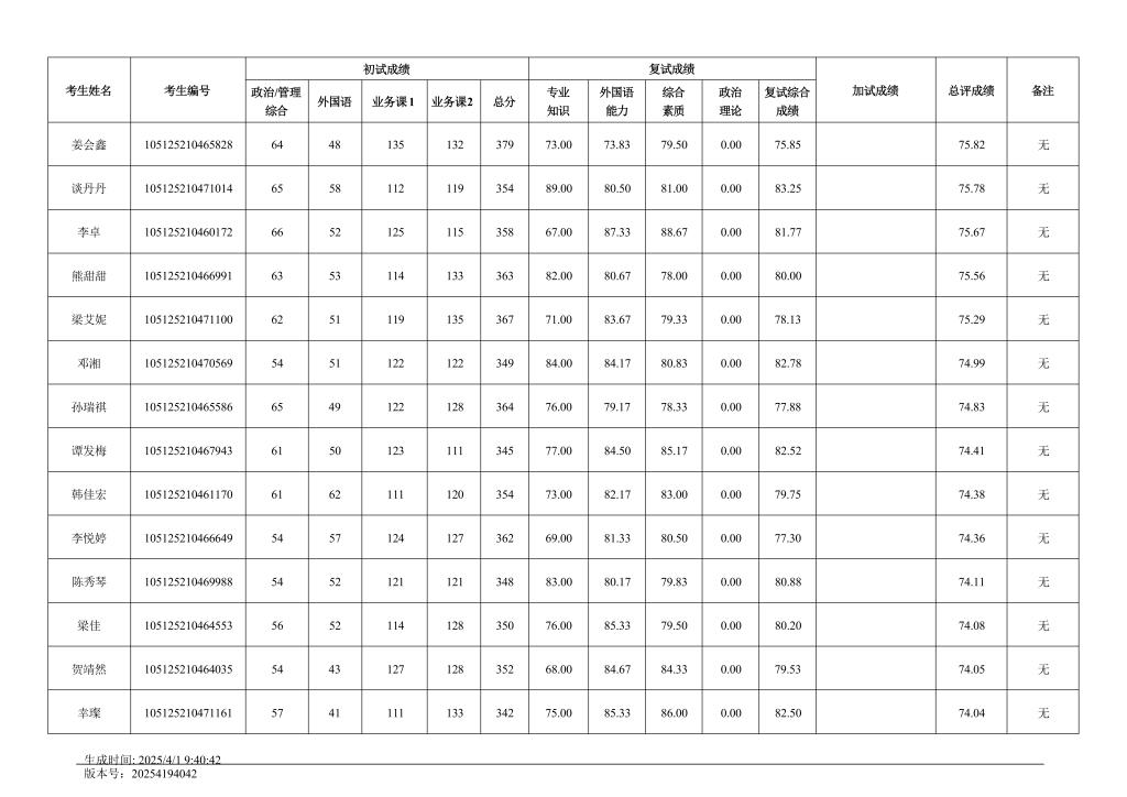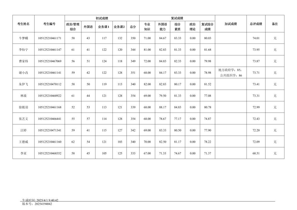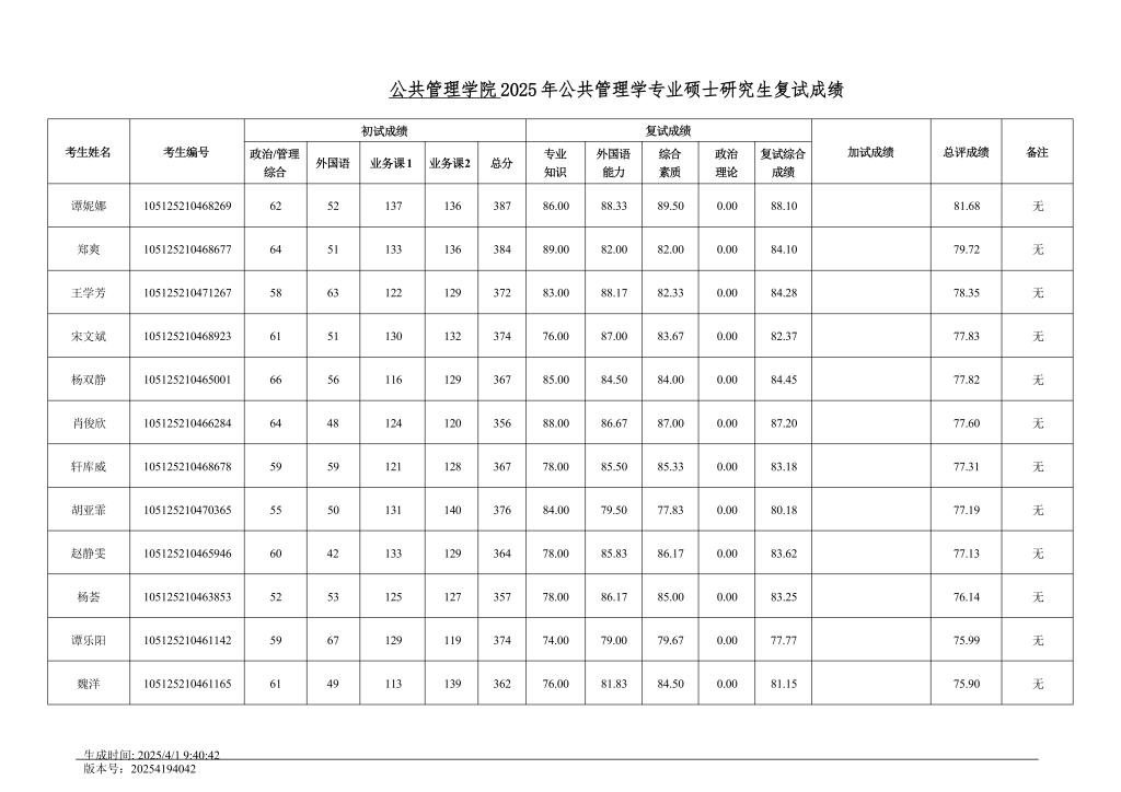 tyc122cc太阳成集团2025年公共管理学专业硕士研究生复试成绩公示