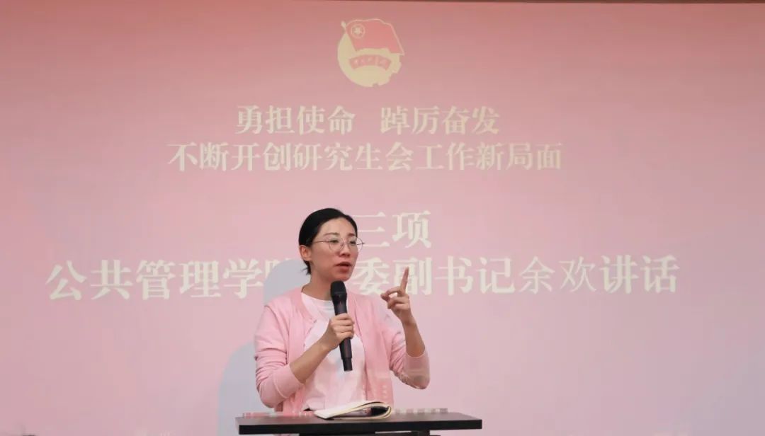 学院党委副书记余欢发表了总结讲话。表达了对新一届研会同学们的欢迎以及对上一届同学们工作的肯定。余欢指出研究生会既是联系学院和研究生的桥梁,也是培养大家管理服务能力、团队协作能力、交流沟通能力和创新思维能力的重要平台。余欢寄语新一届研会成员要不忘初心,牢记宗旨;发挥作用,促进交流;加强协作,打造队伍。希望全体研会成员珍惜锻炼机会,秉承公管学院“永争第一”的传统,再接再厉,再创佳绩!