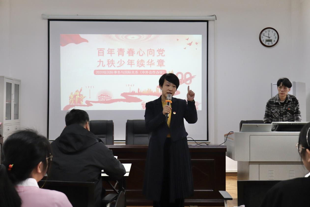 2021年4月26日下午,2020级国际事务与国际关系(中外合作办学)班团支部在学院一楼报告厅开展“百年青春心向党,九秩少年续华章”主题团日活动。校团委书记甘珣、院党委书记唐良敬出席活动。活动由班主任刘健主持。