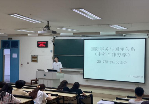 5月9日,国际事务与国际关系(中外合作)专业2018级、2019级的同学们在四号教学楼召开考研交流会。拟录取为武汉大学研究生的甘睿劼就为何考研、如何合理择校、如何规划学习计划、如何制定学习目标等问题向现场同学进行了详细讲解;拟录取为中国科学技术大学研究生的周雨萌向同学们介绍了各科的复习技巧,建议同学们劳逸结合,注重复习效率。对于如何选择出国留学服务机构、如何准备留学申请材料等方面,拟录取为伦敦国王学院研究生的关心仪分享了个人的心得体会。