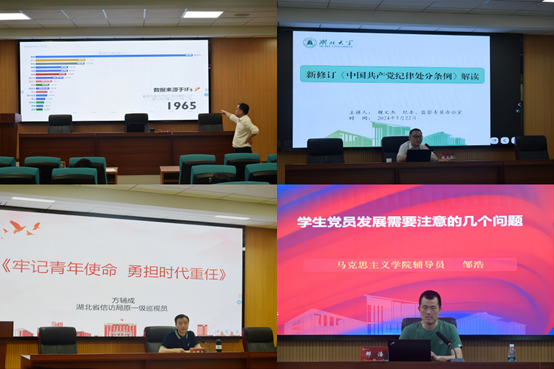 辅导报告环节,学院党委书记唐良敬结合党的理论知识与实践经历,号召参训学员端正入党动机、强化党性修养、积极向党组织靠拢,并结合党纪学习教育,要求参训学员学纪、知纪、明纪、守纪,筑牢思想防线,切实增强思想自觉、政治自觉和行动自觉;校纪委、监察专员办公室纪检监察室主任魏文杰围绕新修订《中国共产党纪律处分条例》的解读,要求学员们严格纪律意识,提高防范水平;省信访原一级巡视员方辅成回顾党史奋斗历程,寄语学员们牢记青年使命,勇担时代大任;马克思主义学院辅导员邹浩围绕“学生党员发展需要注意的问题”,具体讲解党员组织发展程序中容易出现的问题及应对举措。