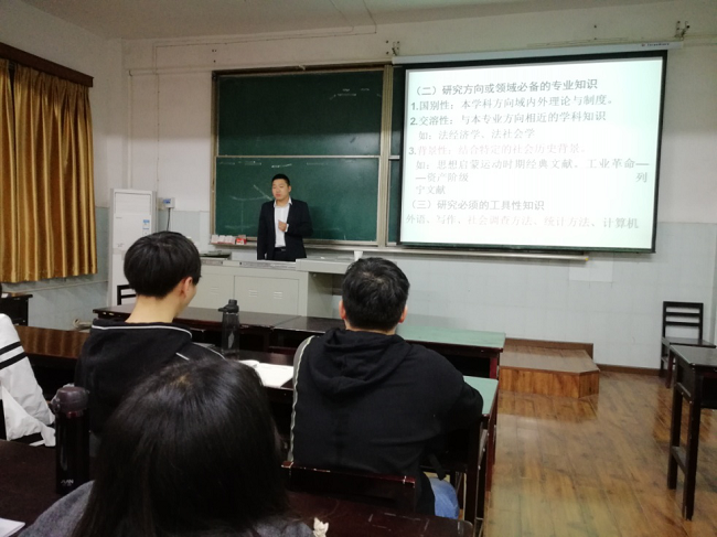 (通讯员 鸿涛)2019年10月23日晚上,我院邀请中国社会科学研究院法学研究所博士后、武汉工程大学年薪制副教授谭家超为研究生做了一场题为《研究生学术积累与学术论文写作》的学术讲座。讲座由我院陈焱光教授主持,法律系刘祎副教授出席,2018级、2019级五十余名法学专业研究生聆听了本次讲座。