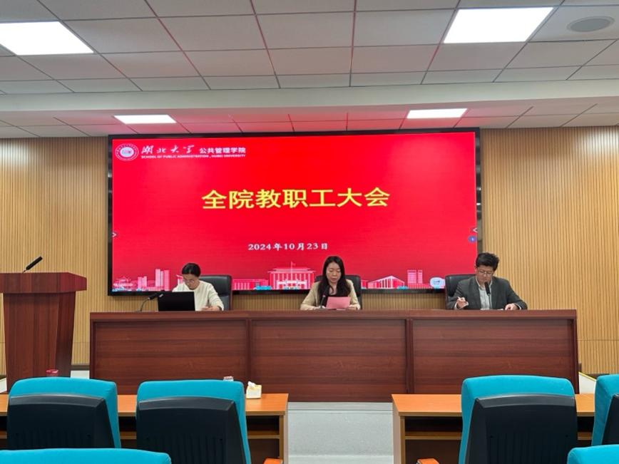 10月23日下午,学院2024年秋季学期第二次教职工大会顺利召开。院长李荣娟、党委副书记余欢、副院长张小进出席会议。