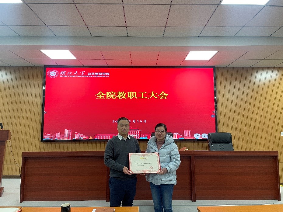 学院党委书记唐良敬为获得“卓越贡献奖”的教师代表颁奖。2024年度,我院教师在人才培养、科学研究和社会服务等方面业绩卓越,产出一系列标志性成果。其中,获国家级课题立项4项、获省委省政府正职领导批示1项、被《中国社会科学文摘》《新华文摘》转载论文3篇、在一类重要期刊发表高水平学术论文6篇、获教育部高等学校科学研究优秀成果奖1项、获省级教学成果一等奖1项,学院教师年度到账科研经费近500万元、人均年度科研经费超过10万元。